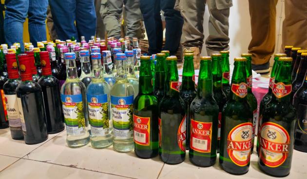 Ratusan botol minuman keras (miras) dari salah satu warung jamu di wilayah Pondok Aren, Tangerang Selatan disita Satuan Polisi Pamong Praja (Satpol PP) Kota Tangerang Selatan, Selasa, 27 Juli 2021 dini hari. (@TangerangNews / Rachman Deniansyah)