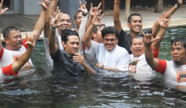 Pasca keputusan MK agar Pilkada diulang, pasangan Arsid-Andre bersama tim sukses melakukan perayaan dengan menyebur ke dalam kolam renang. (tangerangnews / deddy)