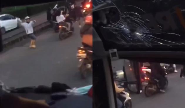 Bus pemain Persis Solo di lemari batu oleh oknum suporter Persita Tangerang di Kelapa Dua, Kabupaten Tangerang, Sabtu 18 Januari 2023. (@TangerangNews / Istimewa)