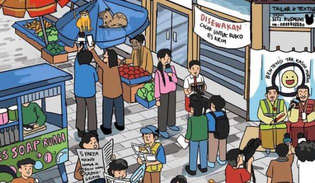 Terdapat juga gambar orang yang tengah membaca media cetak koran, suasana gambar tersebut pun seperti sedang berada di pasar.