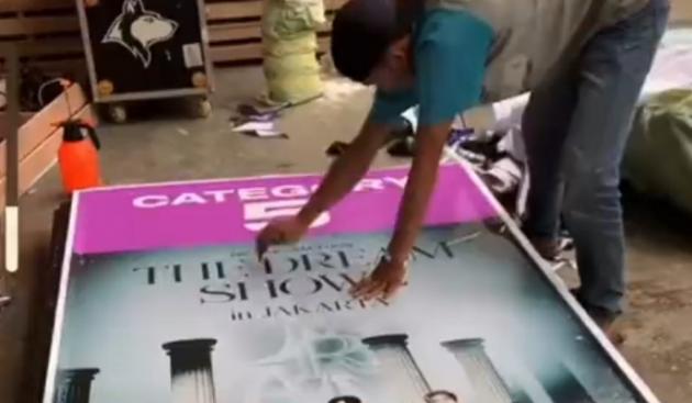 Melansir video yang diunggah oleh akun Twitter @dita_fadilla, tampak para pengrajin papan reklame konser NCT Dream yang bertajuk The Dream Show 2 tengah menyelesaikan pekerjaannya.
