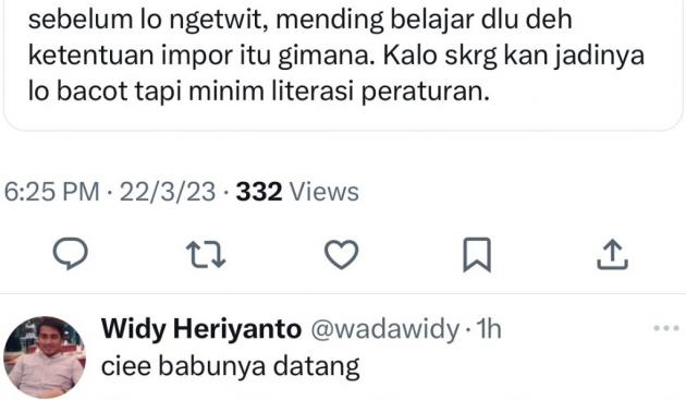 "Sebelum lo ngetwit, mending belajar dulu deh ketentuan impor itu gimana. Kalo sekarang kan jadinya lo bacot tapi minim literasi peraturan," cuit akun @wadawidy yang kini telah dihapus dikutip dari liputan6.com, Jumat 24 Maret 2023.