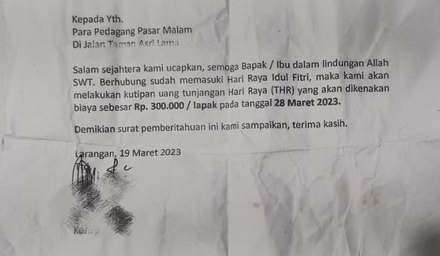Barang bukti surat permintaan jatah THR yang disebar sekelompok masyarakat ke pedagang Pasar Malam Cipadu, Kecamatan Larangan, Kota Tangerang, Rabu 29 Maret 2023. (@TangerangNews / Rangga Agung Zuliansyah)