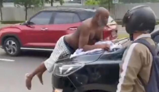 WNA itu bahkan tidak ragu menaiki kap bagian depan mobil, ia pun sempat menunjuk-nunjuk ke arah langit.