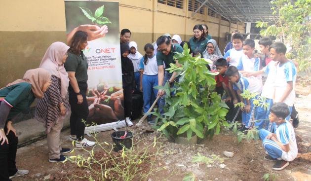 Seperti di SDN Karet 01 Jakarta Selatan, QNET mengatasi tantangan ini dengan menanam pohon di sekitar lingkungan sekolah.