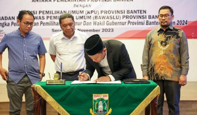 Penyerahan dilaksanakan usai Penandatangan Naskah Perjanjian Hibah Daerah (NPHD) antara Pemerintah Provinsi Banten dengan KPU dan Bawaslu Provinsi Banten, dalam rangka Pelaksanaan Pemilihan Gubernur dan Wakil Gubernur Provinsi Banten Tahun 2024 di aula Dinas PUPR Provinsi Banten, KP3B, Kota Serang, Rabu 8 November 2023.