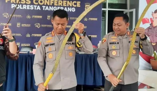 Polresta Tangerang menunjukkan barang bukti kasus kriminal yang ditangani selama 2023 pada Selasa, 26 Desember 2023. (@TangerangNews / Rangga Agung Zuliansyah )