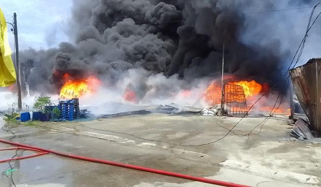 Kobaran api yang membakar pabrik produksi palet plastik di Kampung Keroncong, Kecamatan Jatiuwung, Kota Tangerang, ludes terbakar, Jumat 12 Januari 2024, siang. (@TangerangNews / Rangga Agung Zuliansyah)
