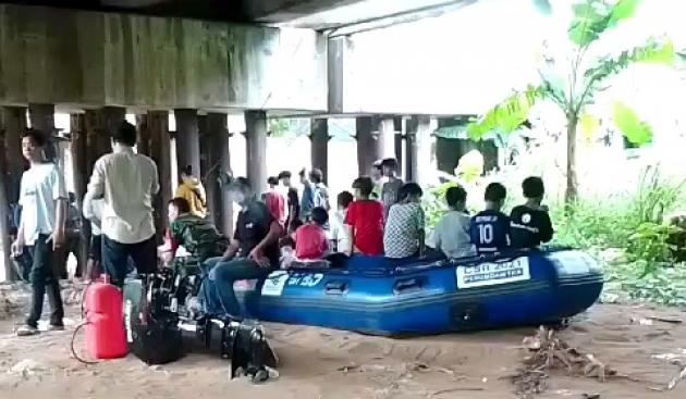 Warga melakukan pencarian pria yang diduga hanyut di Sungai Cisadane, kolong jembatan Gading Serpong, Serpong Utara, Kota Tangsel, Minggu 18 Februari 2024. (@TangerangNews / Yanto)