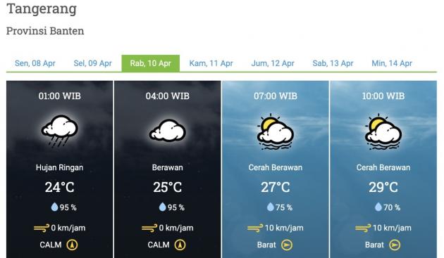“Kota Tangerang diprakirakan akan mengalami hujan dengan intensitas ringan pada malam menjelang Lebaran. Namun dipagi hari saat Hari Raya Idulfitri akan cerah berawan, lalu siang hari akan kembali hujan sedang hingga ringan di sore hari dan berawan di malam hari,” terangnya.