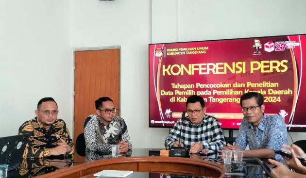 Ketua KPU Kabupaten Tangerang Muhamad Umar (tengah) menggelar jumpa pers tahapan Coklit data pemilih Pilkada Kabupaten Tangerang, Jumat 28 Juni 2024. (@TangerangNews / Istimewa)