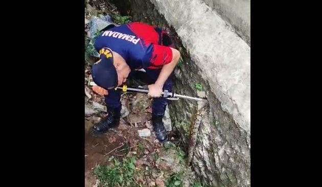 Petugas BPBD Kota Tangerang mengevakuasi ular sanca sepanjang 3,5 meter yang terjepit di saluran air pemukiman warga Kelurahan Koang Jaya, Kecamatan Karawaci, Kota Tangerang, Jumat 19 Juli 2024. (@TangerangNews / Rangga Agung Zuliansyah)