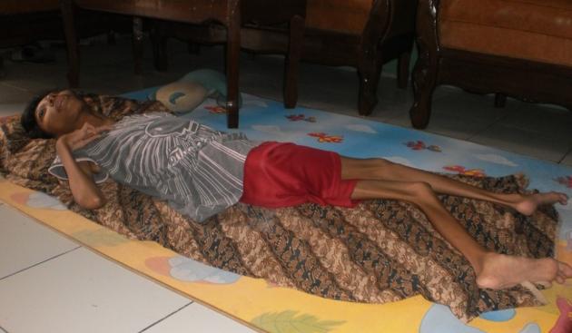 “Kedua tangannya menekuk, tidak bisa diluruskan. Badannya juga sering panas. Saya cuma mengobatinya di Puskesmas. Karena tidak punya biaya, jadi jarang berobat lagi. Akhirnya, sampai sekarang kondisinya seperti ini,” katanya, Minggu (19/6).