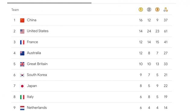 China ditempel Amerika Serikat di urutan kedua dengan 14 emas, 24 perak dan 23 perunggu. Posisinya menggeser Prancis yang berada di urutan ketiga dengan 12 emas, 14 perak dan 15 perunggu, seperti dikutip dari Okezone.