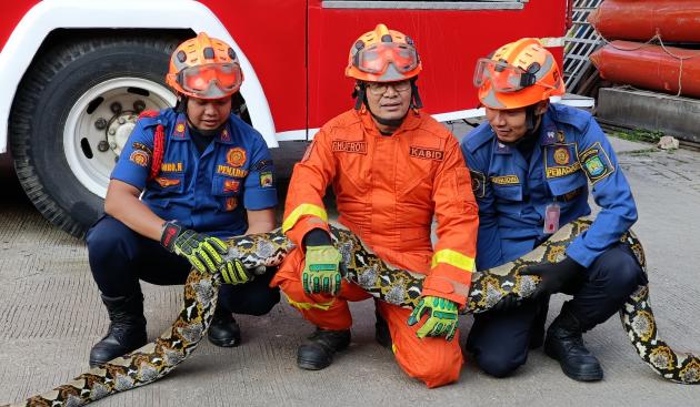 Tidak memakan waktu lama, petugas berhasil menangkap dan mengevakuasi ular sanca batik tersebut.