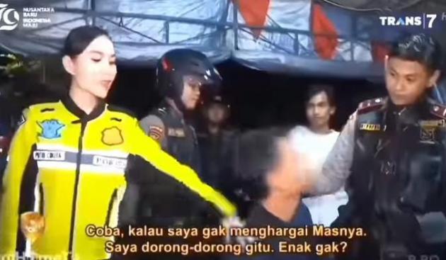 "Heh, mas. Kalau lagi diajak ngobrol tuh emang sopan, ya, sambil makan? Sopan enggak begitu, saya tanya?" ujar Brigadir Cikita kesal.