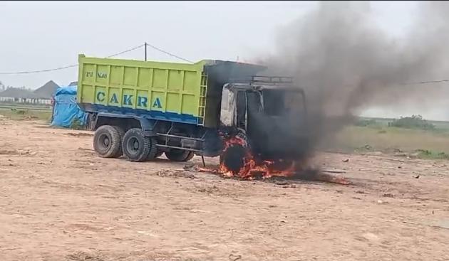 Truk tanah yang dibakar warga di Jalan Puri Niaga Indah, Kampung Melayu Timur, Kecamatan Teluknaga, Kabupaten Tangerang, Kamis 7 November 2024. (@TangerangNews / Yanto)