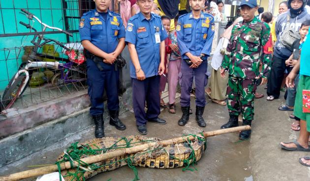TANGERANGNEWS.com-Buaya dengan ukuran panjang tiga meter diamankan petugas BPBD bersama warga saat memasuki pemukiman di Kampung Tangkele, Kecamatan Solear, Kabupaten Tangerang.