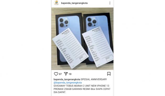 TANGERANGNEWS.com- Baru-baru ini, akun Instagram resmi milik Badan Pendapatan Daerah (Bapenda) Kota Tangerang, @bapenda_tangerangkota, mengunggah promosi giveaway tebus murah berupa iPhone 13 Pro Max.