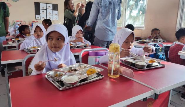 Pelaksanaan program makan bergizi gratis digelar SD Negeri Lengkong Gudang, Kecamatan Serpong, Kota Tangerang Selatan (Tangsel), pada Senin 13 Januari 2025. (@TangerangNews / Yanto)