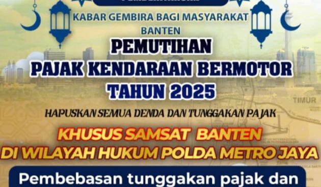 Penghapusan denda pajak kendaraan atau pemutihan ini akan mulai berlaku pada 10 April 2025 hingga 30 Juni 2025 mendatang, di semua Samsat Banten di wilayah hukum Polda Metro Jaya.