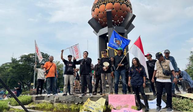 Sambil membentangkan spanduk dan poster, massa aksi berkumpul dan menyampaikan aspirasinya di depan Kantor Polres Metro Tangerang Kota, Jalan Perintis Kemerdekaan, Kota Tangerang.