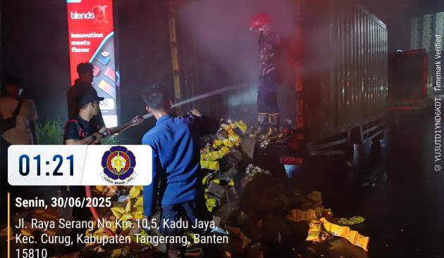 Mobil boks bermuatan sembako terbakar di Jalan Raya Serang, Kelurahan Kadu Jaya, Kecamatan Curug, Kabupaten Tangerang. (@TangerangNews / Yanto)