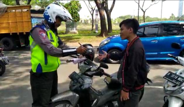 Tampak seorang pengendara sepeda motor tidak terima saat dirinya hendak ditilang oleh petugas Satuan Lalu Lintas Polres Tangerang Selatan di Jalan Boulevard, Cilenggang, Serpong, Selasa (5/11/2019). (@TangerangNews / Rachman Deniansyah)