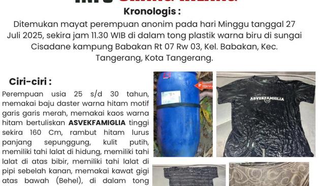 Dalam pengumuman info orang hilang yang disebar pada Senin 28 Juli 2025 tersebut, disebutkan penemuan mayat tanpa identitas di dalam drum plastik warna biru pada Minggu 27 Juli 2025, sekitar pukul 11.39 WIB.