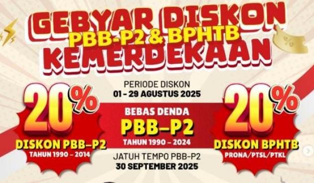 Tidak hanya itu, ada juga pembebasan denda untuk PBB-P2 tahun 1990–2024, serta diskon 20 persen Bea Perolehan Hak atas Tanah dan Bangunan (BPHTB) khusus pada program pemerintah seperti Prona, PTSL, dan PTKL.