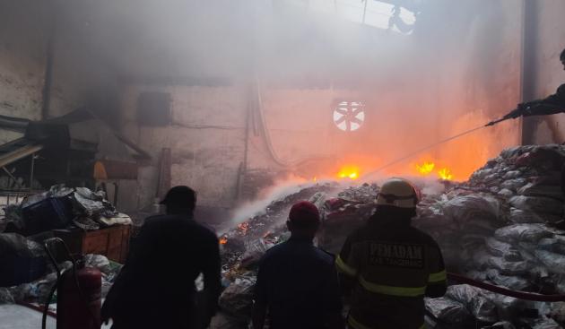 Gudang milik PT Karung Guni Sejahtera, yang khusus menyimpan limbah baterai, nyaris rata dengan tanah akibat amukan si jago merah. Peristiwa itu terjadi berada di Pergudangan Laksana Blok FC 25, Desa Laksana.
