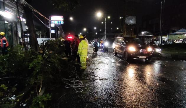 Hingga malam, petugas BPBD, PLN, dan kepolisian masih berjibaku membersihkan sisa pohon roboh.