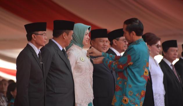 TANGERANG SELATAN-Presiden Joko Widodo (Jokowi) memberikan penghargaan kepada Wali Kota Tangerang Selatan (Tangsel) Airin Rachmi Diany berupa piagam Satya Lencana Pembangunan dan Satya Lencana Wira Karya.