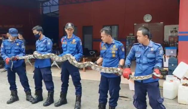 TANGERANGNEWS.com-Seekor ular sanca dengan panjang 5 meter yang sempat menghebohkan warga Kampung Pasar, RT 04/13, Kelurahan Jombang, Kota Tangerang Selatan, telah diamankan di Kantor Dinas Pemadam Kebakaran dan Penyelamatan Kota Tangerang Selatan, Serpong Utara, Tangsel.